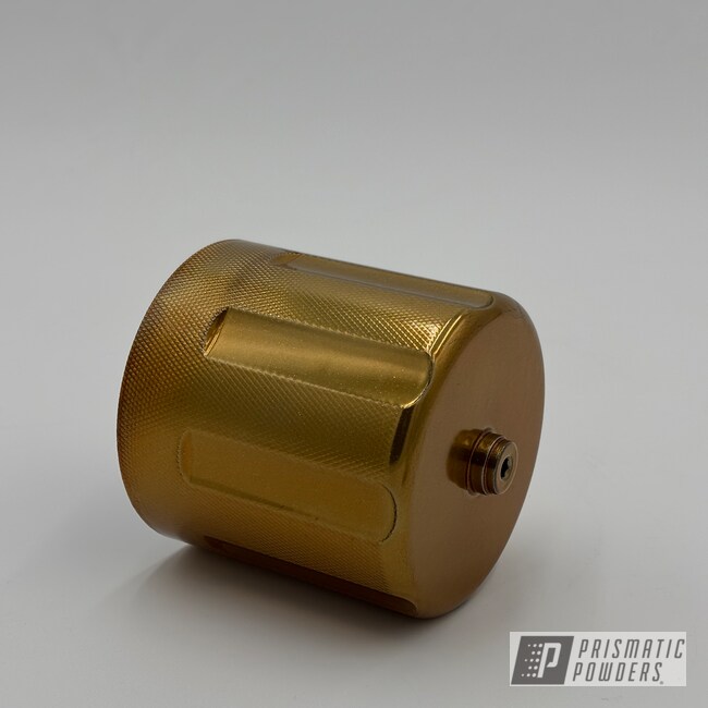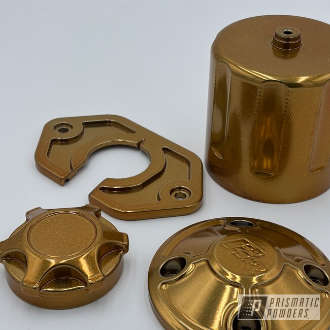Custom automotive parts powder coated in a striking Flaming Gold finish, giving them a bold, metallic shine with a smooth, durable surface.